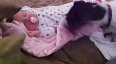 風邪をひかないように赤ちゃんに毛布をかけようとするワンコ