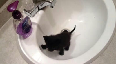 洗面台から出られなくて悪戦苦闘するくろこねこ|あに丸ズッキーニ