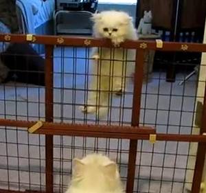 こっちにおいで ゲージをよじ登るネコの親子がかわいい