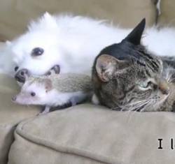 仲のいい三匹 ワンコ・ネコ・ハリネズミ|あに丸ズッキーニ