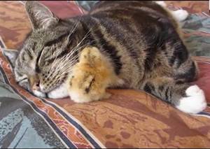 ネコさんに潜り込んで眠ろうとするヒヨコさんが激カワで萌えるWW