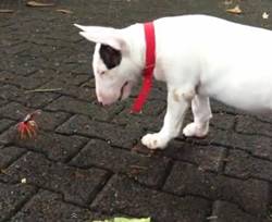 カニで遊ぶブルテリア|あに丸ズッキーニ