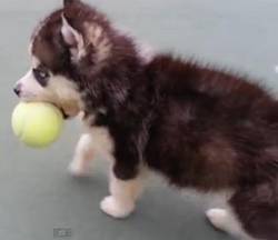 小さいお口に大きいテニスボールをくわえてトコトコ歩くハスキー犬の赤ちゃん|あに丸ズッキーニ