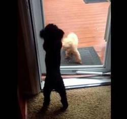 黒のワンコが中からドアを開けて他のワンコを入れてあげる