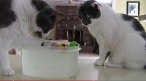 少し違和感?? 水の上に浮かぶピン球で遊ぶ猫さん達
