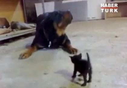 おチビのクロネコちゃんと大きいワンコの威嚇合戦