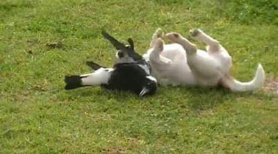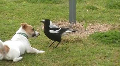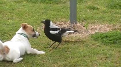 カササギフエガラスが犬みたいになってワンコと遊んでる|あに丸ズッキーニ