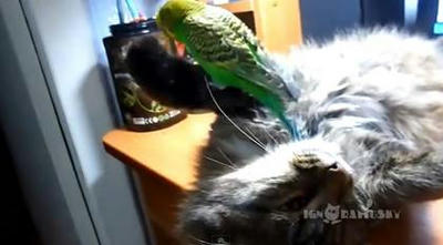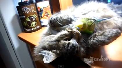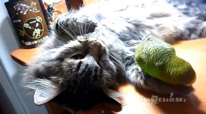 寝ぼけているネコさんにやりたい放題のインコさん|あに丸ズッキーニ