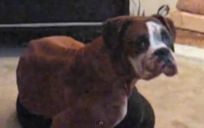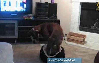 猫さんのベットで眠ろうとする大きいワンコ|あに丸ズッキーニ