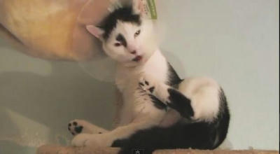 エリザベスカラーをしながら毛づくろいをし始めるネコさん|あに丸ズッキーニ