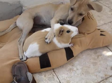大きすぎるモルモットを溺愛するワンコ