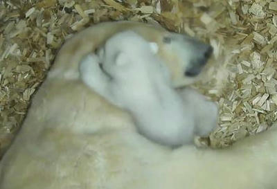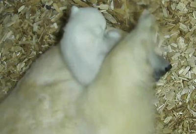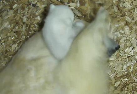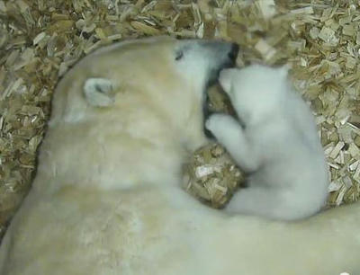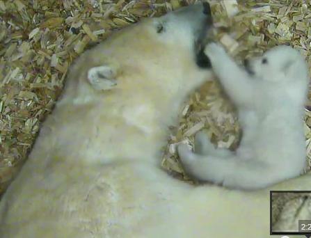 シロクマの赤ちゃんがママのお耳で遊んでる|あに丸ズッキーニ