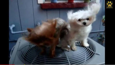 下から吹くファンの風を楽しむワンコ達|あに丸ズッキーニ