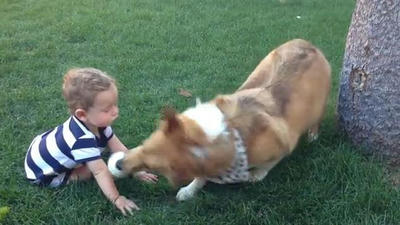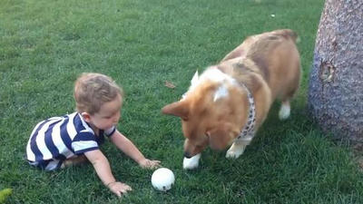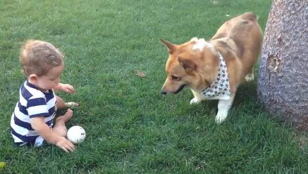 ボール遊びをするにはまだはやい赤ちゃんとコーギー|あに丸ズッキーニ