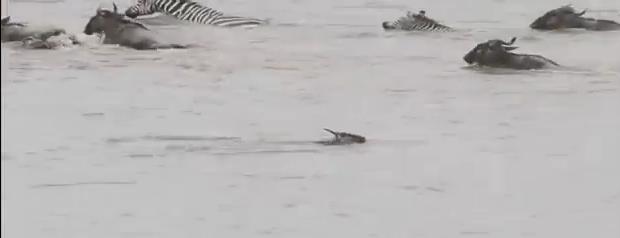 一斉にヌーの大群が河を渡りますシマウマも一緒にわかっているのが見えます