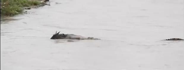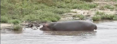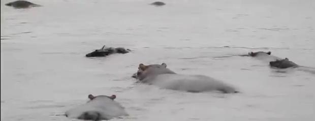 アフリカの大草原の移動でワニに捕まったヌーの子供を助けようとするカバさん