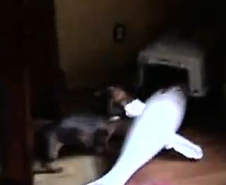 大物を捕まえて小屋に入れようと格闘するワンコ