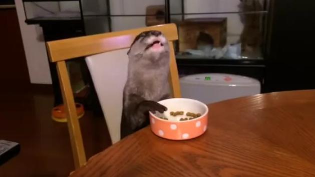 手を使って上手に食べるカワウソ君|あに丸ズッキーニ