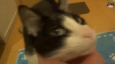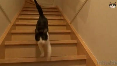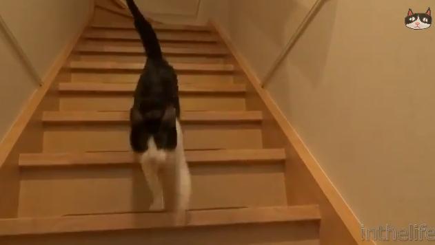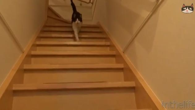 クールな顔したネコさん ドアの音がなると急いで階段を降りてくる|あに丸ズッキーニ