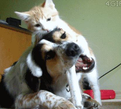ワンコの頭で遊ぶネコさん達 GIFアニメ10枚|あに丸ズッキーニ