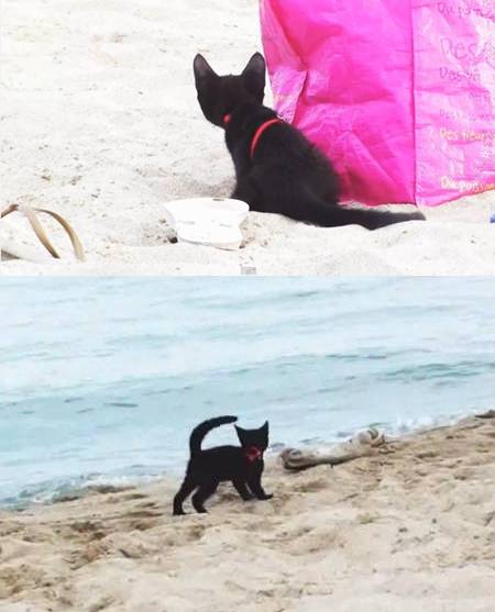 初めてのビーチに興奮している黒ネコちゃん