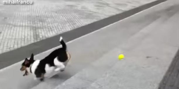 坂道を使って転がしてそれを捕まえる遊びをするワンコ