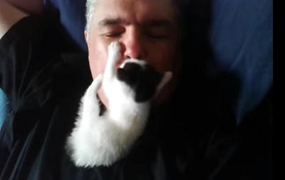 飼い主パパさんの顔に甘える仔猫がかわゆす