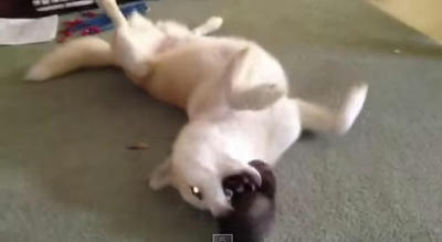 瞳をライトオンしながらフェレットとじゃれあうワンコ