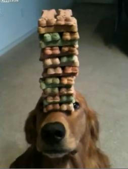 犬の頭にオヤツのビルディング