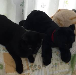 飼ってる猫そっくりのぬいぐるみを買ったら気に入ってくれた。同じポーズするし、脱水が心配なのに水飲んでくれないからぬいぐるみをエサ置き場に置くと飲んでくれる pic.twitter.com/XzAWfV1PId