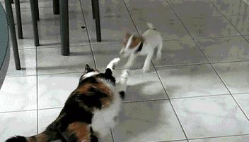 デブ猫 子犬と遊ぶ