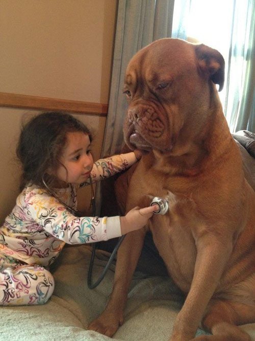 かわいいお医者さんに診察を受けるワンコ