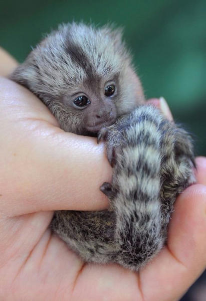 人の親指にしっぽを巻きつけるミニモンキーの赤ちゃん