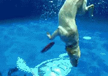 水中に落ちたフリスビーをとるワンコ
