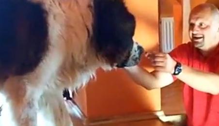2階に登って降りられなくなったセントバーナードを下ろそうとする動画