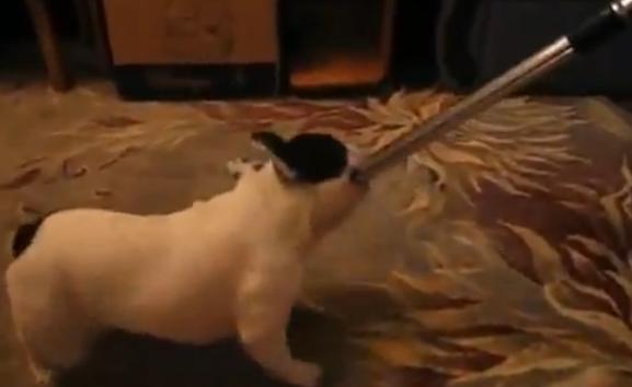 掃除機と戦うフレンチブルドッグ