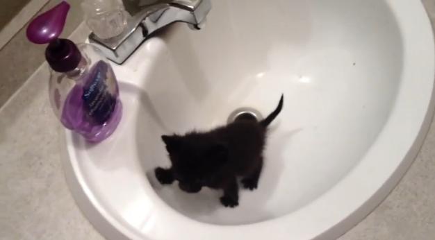 洗面台から出られなくて悪戦苦闘するくろこねこ