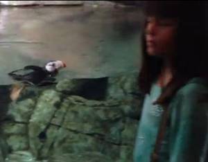 少女と追いかけっこをするツノメドリ