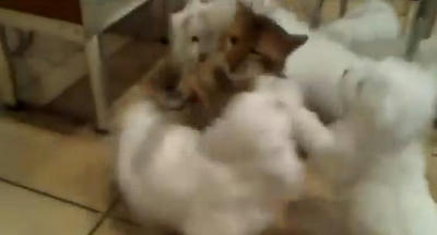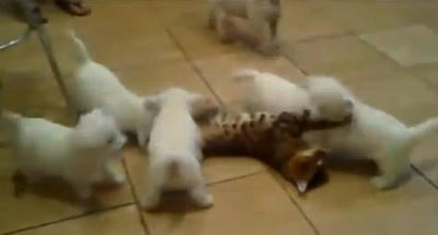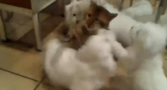 子犬の大群に襲われるネコさん|あに丸ズッキーニ