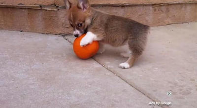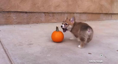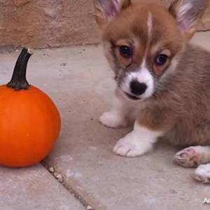 ちいさいカボチャで遊ぶコーギーの仔犬がかわいい