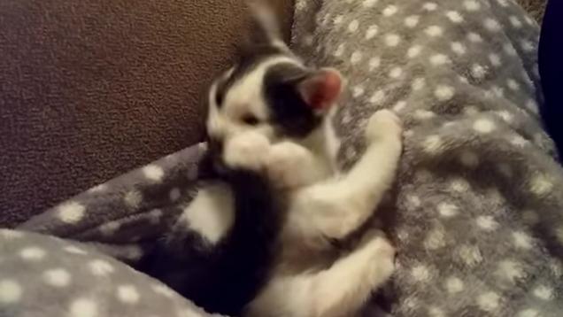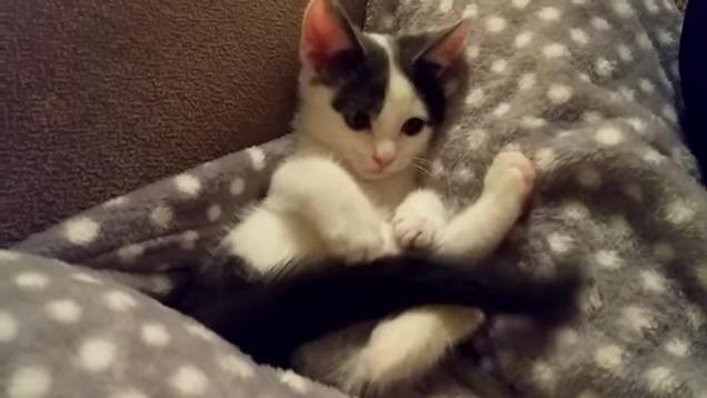 自分のシッポが気になり噛み付いちゃう仔猫がかわいい