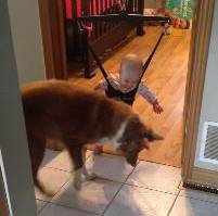 赤ちゃんをあやしている風に見えて実は影で遊んでいるワンコ