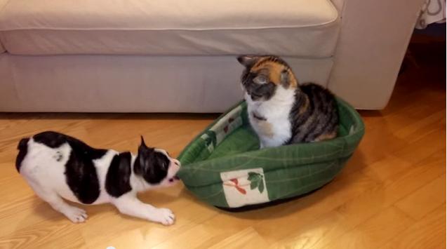 ネコさんにベッドを取られ悪戦苦闘するワンコちゃん(T_T)|あに丸ズッキーニ