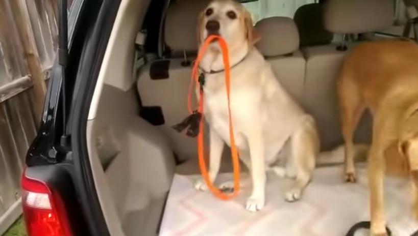 クルマに乗り込むと挟まないように素早くリードをくわえるワンコ