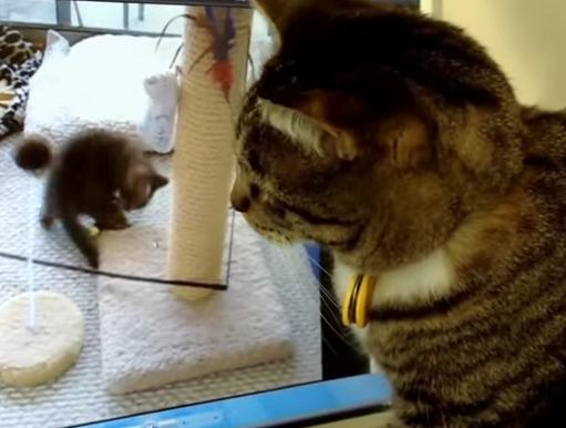 TV画面の仔猫が気になるネコさん 画面が消えると探しに行きました