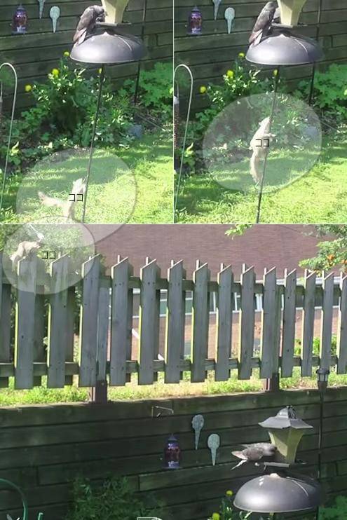 最初は普通に登って餌場へ行こうとしますがねずみ返しみたいなもので跳ね返されると、