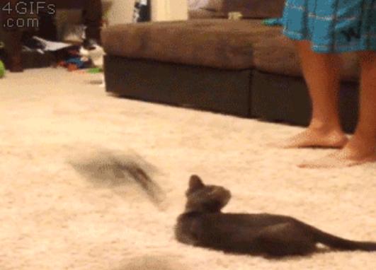 GIF オモチャに集中しているネコさんに突然クモが・・・