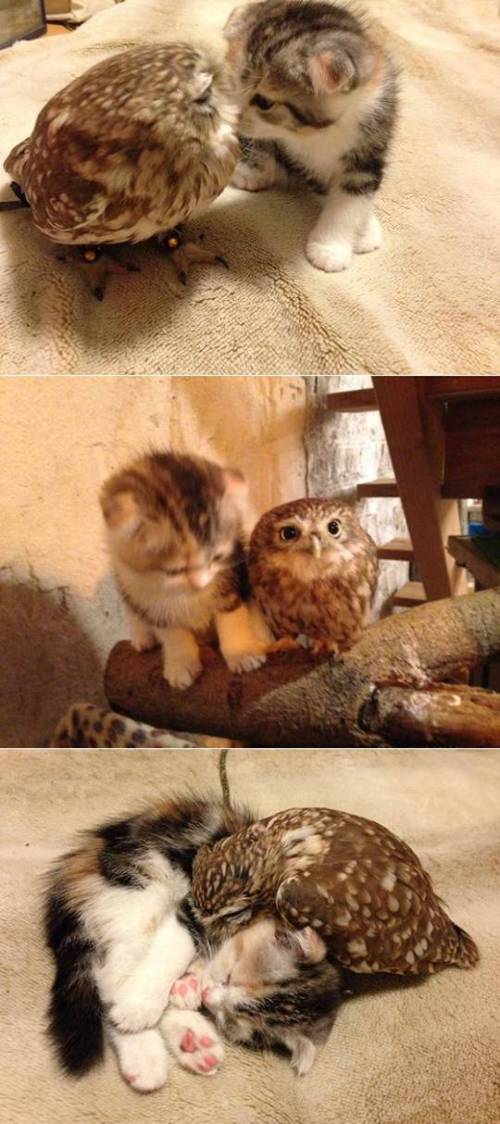とっても仲良しフクロウさんと仔猫ちゃん