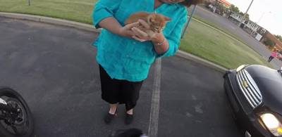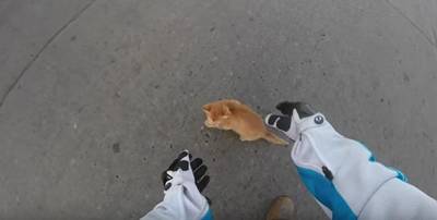 左折しようとした瞬間 仔猫がうずくまっているのをバイクに乗ってる女性が発見したみたい