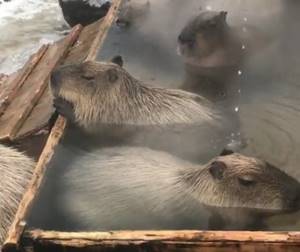 年越し温泉、カピバラ温泉!!湯気がいい感じです。#那須どうぶつ王国 #カピバラ温泉